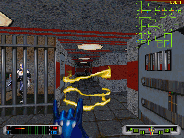 On first impressions this is every bit a Doom clone. I run around the first area blasting guards with my psychic fireballs. The graphics are the usual blocky affair for 3D games from this period. They are in 640×480 SVGA though and the textures are really sharp. The people running around the level are near enough photo quality. The guards talk a bit as well which adds to the atmosphere and this is definitely a step up from Doom.