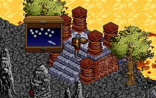 This room has 3 statues of the Zealan gods. I take the hint from the book I read earlier and drop the shield on the altar. The old gods all speak to me (in full speech again) telling me to go into the next room and get a blackrock pyramid from the spirit in there.
