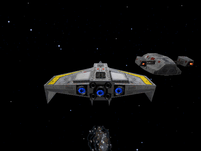 The demo is another 5 minute gauntlet. I have to autopilot out to a nav point in a Hellcat and take down as many confed/pirate ships in the time as possible. These are launched from a frigate in pairs.