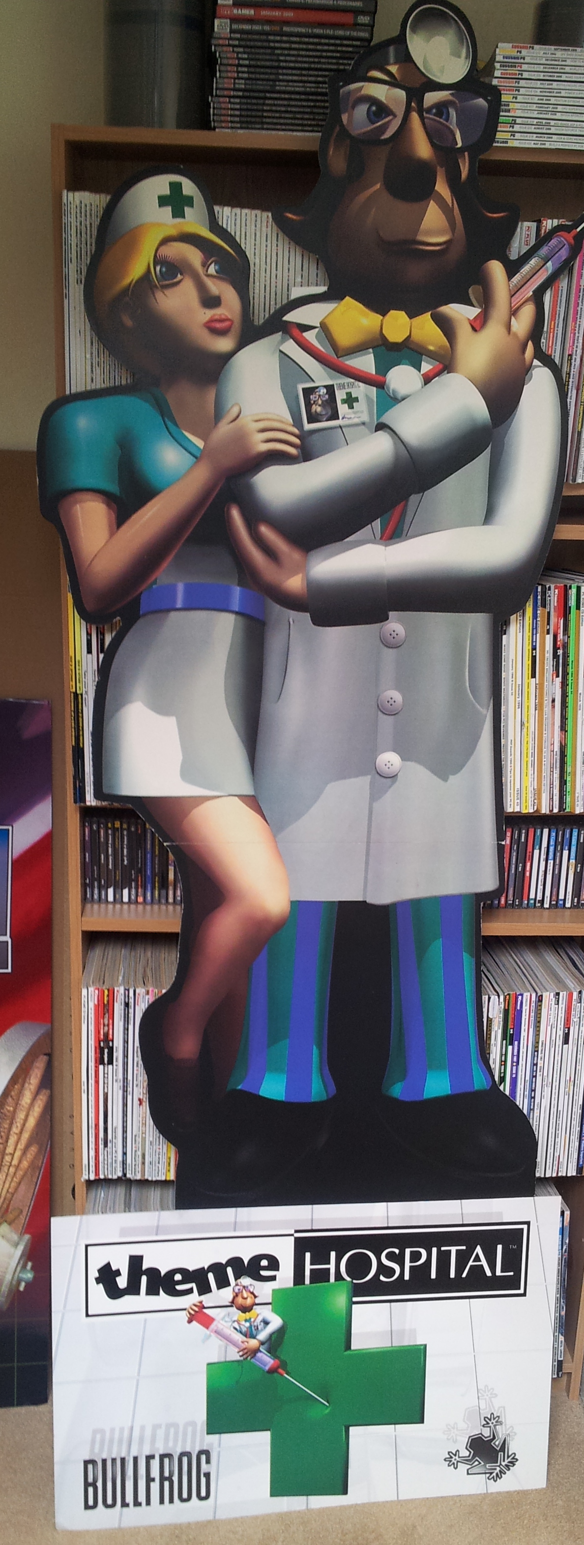 The item in question is a standup advert for Theme Hospital that I picked up at the same time as the Bioforge one. It appears to have never been used as the foldout supporting sections at the back are still intact, although I’m not convinced they are large enough to hold this thing up in the first place. I resorted to leaning it up against one of my bookcases of old gaming mags in order to grab a photo.