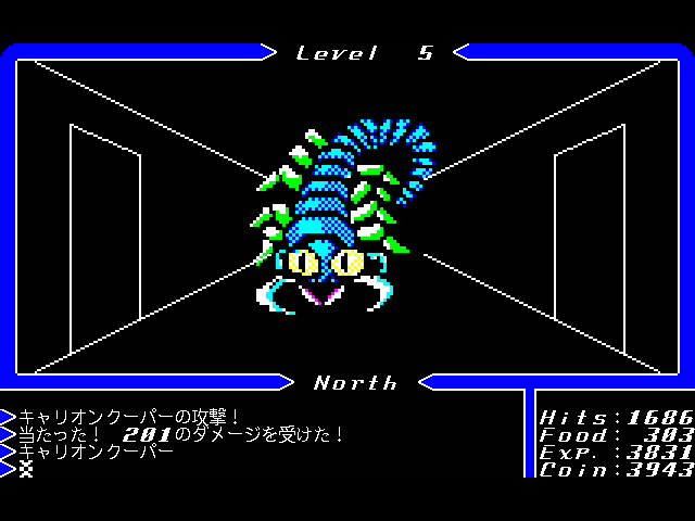 The monster graphics were also used in the FM-Towns version but again these are dithered with the reduced colours. One oddity of this port is that the sprites only have two sizes but still show at all distances, so if there is a chest at the end of a long corridor it looks the same size however far away you are until you are standing on it. This gives the impression that it’s running away from you when you walk towards it and is a little disconcerting. The engine also can’t cope with drawing one sprite behind another (unlike the Apple II original). If a monster is standing on a chest, you can’t see it and will only know it’s there when you start losing hitpoints.
